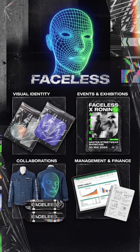 I worked and manage at Faceless, an association dedicated to promoting Nantes-based artists, as both a graphic designer and treasurer. I designed the visual identity for our events, exhibitions, and collaborations, including with streetwear boutiques like MILK and RONIN. Additionally, I managed the budgets to ensure the financial viability of our projects, blending creativity and financial management. This experience is now an integral part of my portfolio.